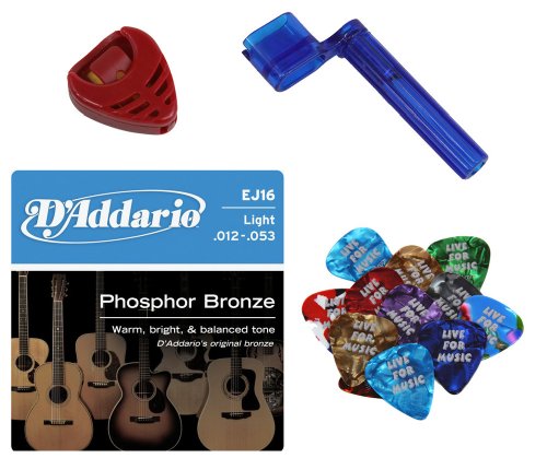 D'Addario EJ16 Phosphor Bronze Light Acoustic Guitar Strings with BONUS "Live For Music" Guitar Picks, Pick Holder and String Winder Feature